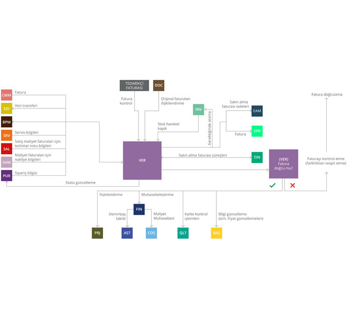 Satınalma süreci yürütülürken, bir taraftan Satınalma Yönetimi modülünde satınalma siparişi oluşturulur ve diğer taraftan ise Stok Yönetimi modülünde mal girişi kaydedilir. Entegre fatura kontrolünün yürütülebilmesi için bu belgelere bir referans oluşturulması gerekir. Fatura Kontrol modülünde kullanıcılar, tedarikçi numarası, satınalma siparişi numarası, tarih gibi ilgili ölçütleri kullanarak söz konusu satınalma siparişini veya mal girişini kolaylıkla arayabilir. Burada satınalma siparişlerinden fiyatlar ve mal girişinden miktarlar (Varsa iade düzeltmesi ile) bulunabilir. Mevcut faturanın miktar, fiyat ve koşullar açısından doğru olup olmadığı sistem üzerinde otomatik olarak kontrol edilir. Envanter girişi beklenmeyen satınalma siparişlerine ilişkin değer faturaları da oluşturulabilir ve miktarlar da denetlenebilir. Bunlara ek olarak ön ödemeli siparişlerle ilişkili olarak ön ödeme faturası oluşturulurken konsinye siparişler için de konsinye faturaları oluşturulması mümkündür.